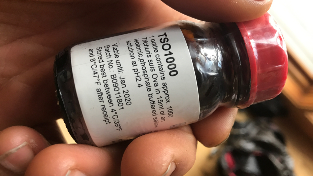 I then ordered the pig whipworm Trichuris suis (TS) from Tanawisa Company in Thailand. Under controlled conditions, at least some helminth species, such as TS, seem to interact with humans in highly complex and apparently beneficial ways, modulating the immune system in preliminary studies while positively impacting inflammatory bowel and other autoimmune diseases. For example, TS dosing has been shown to produce significant and long lasting improvements in Crohn's disease, probably by modulating parts of the immune system responsible for producing gut inflammation (known as Th1-type inflammation). FDA has even granted TS the status of Investigational New Drug, allowing clinical trials in humans, and currently, a clinical trial is underway to assess the possibility of TS therapy in autism treatment.