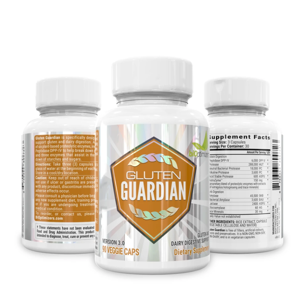 BiOptimizers Gluten Guardian is a unique formulation that alleviates gut-irritation from gluten and casein foods. Taken before meals, Gluten Guardian will help you digest so you can dine out and enjoy yourself, completely free of worry.