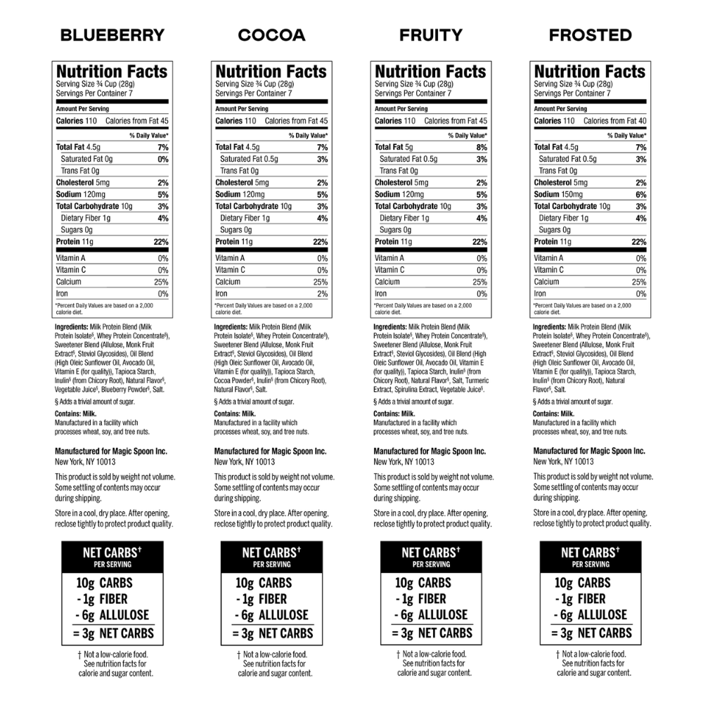 Magic Spoon uses a natural blend of monk fruit, stevia, and allulose. Allulose is a “rare” sugar found in things like figs and maple syrup. It tastes just like “regular” sugar but has almost zero glycemic impact and almost zero calories (less than 0.4 cal/g).