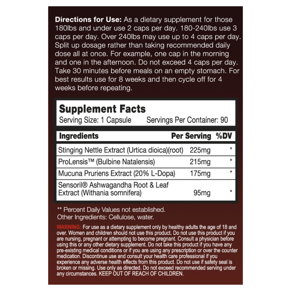 What happens, when you take a supplement with the right amounts of Bulbine Natalensis, Stinging Nettle Root, Mucuna Pruriens and Ashwagandha? You ramp up free and total testosterone, reduce estrogen and prolactin, mitigate cortisol and increase DHEA, and support dopamine and growth hormone.*